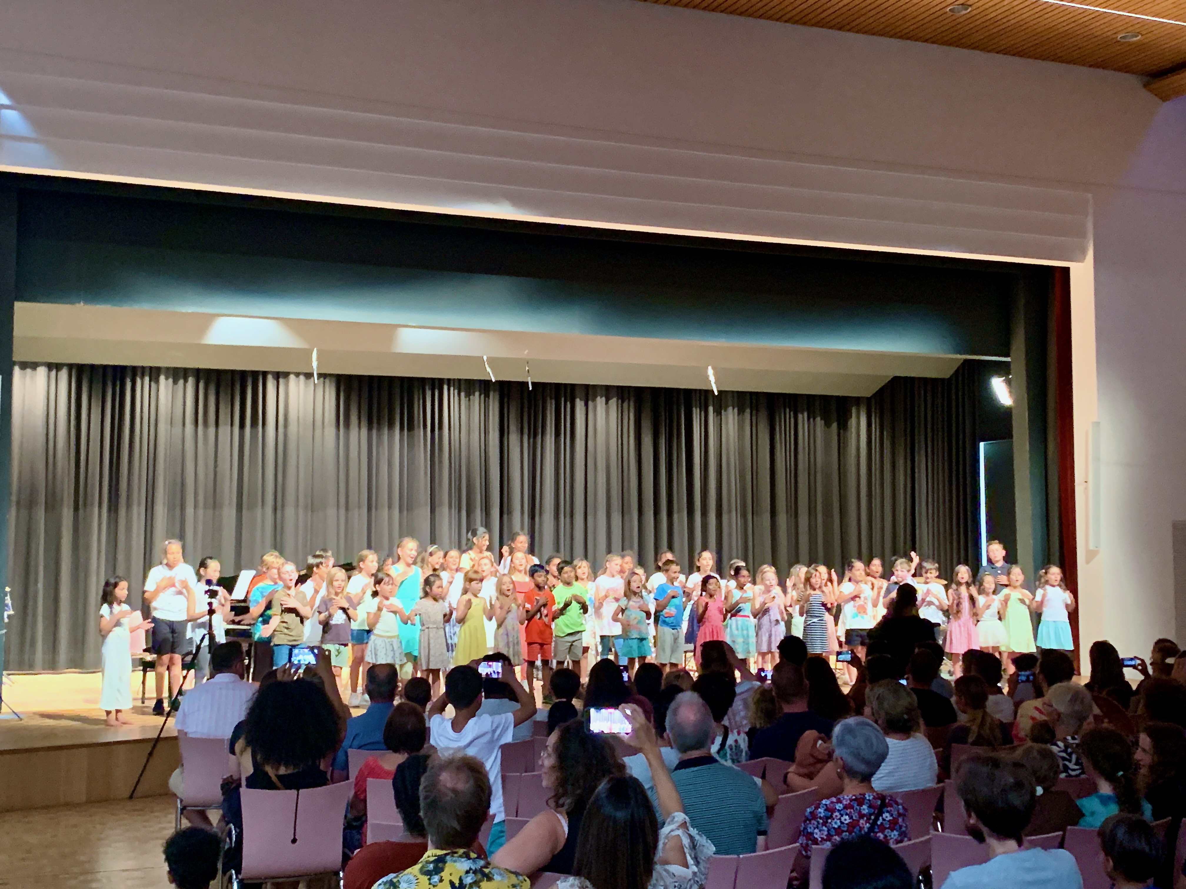 Das Konzert am Abend fand in der Turnhalle Leinfeld statt und wurde mit einem gemeinsamen Begrüssungslied eröffnet. Danach präsentierten die vier Ensembles ihre einstudierten Stücke. Es war sehr beeindruckend zu sehen und zu hören, was die Kinder und Jugendlichen in dieser kurzen Zeit geleistet haben.